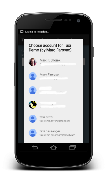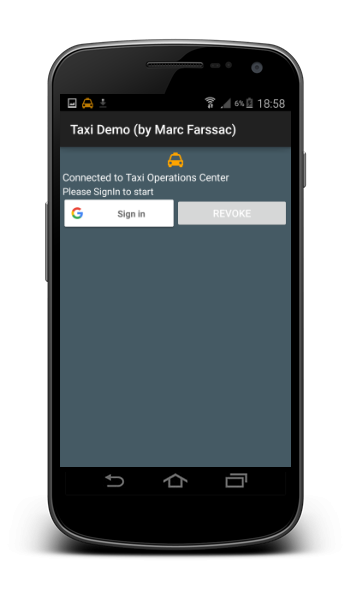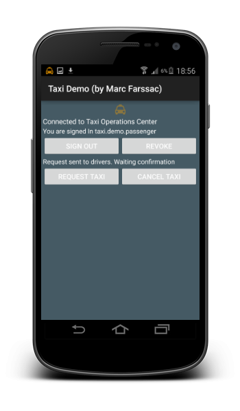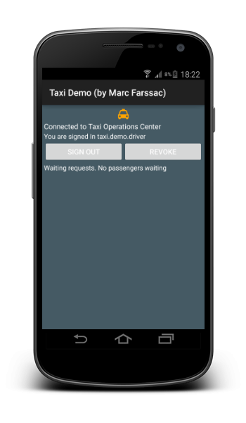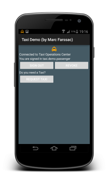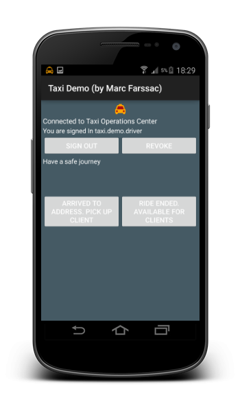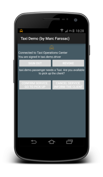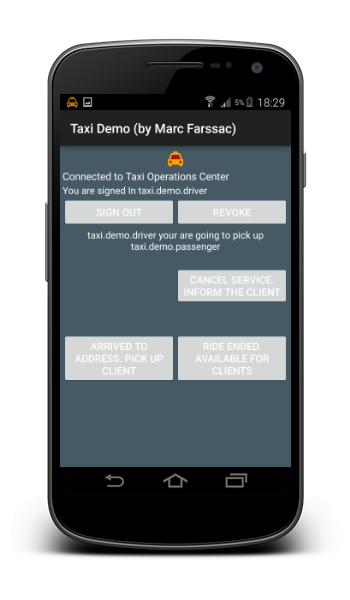 - The GCM Connection Server accepting downstram messages from the App server (runing on Google App Engine and programmed in Java) and sending them to the Android client (acting as a driver and passenger based on their email)
